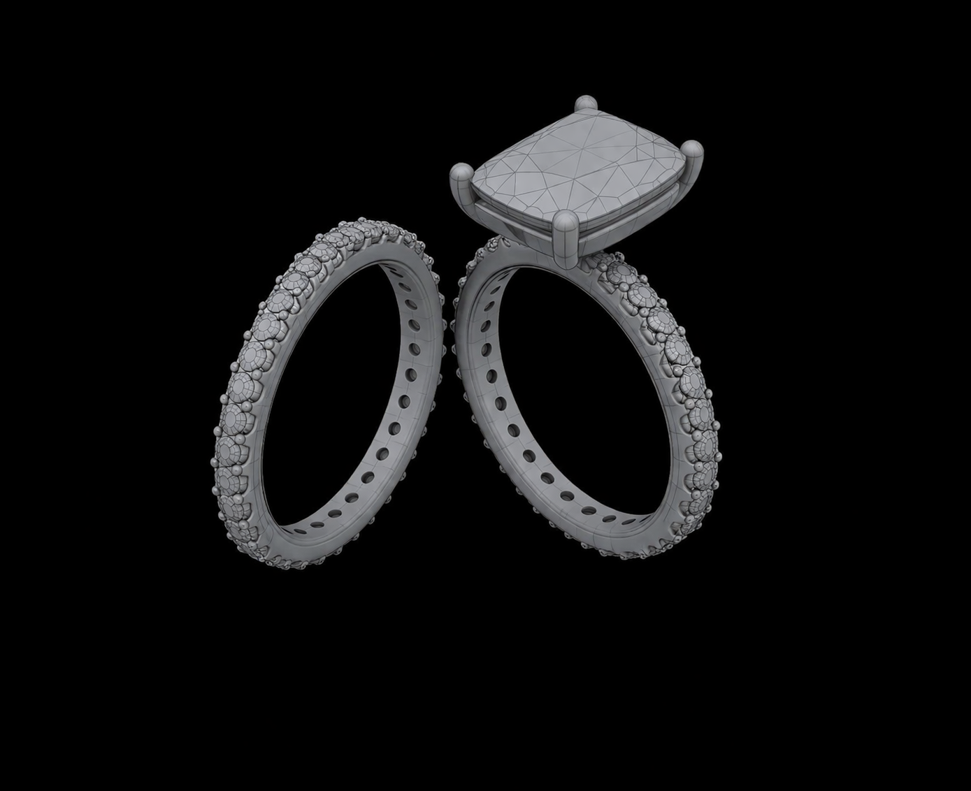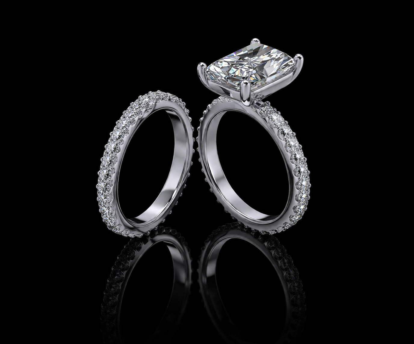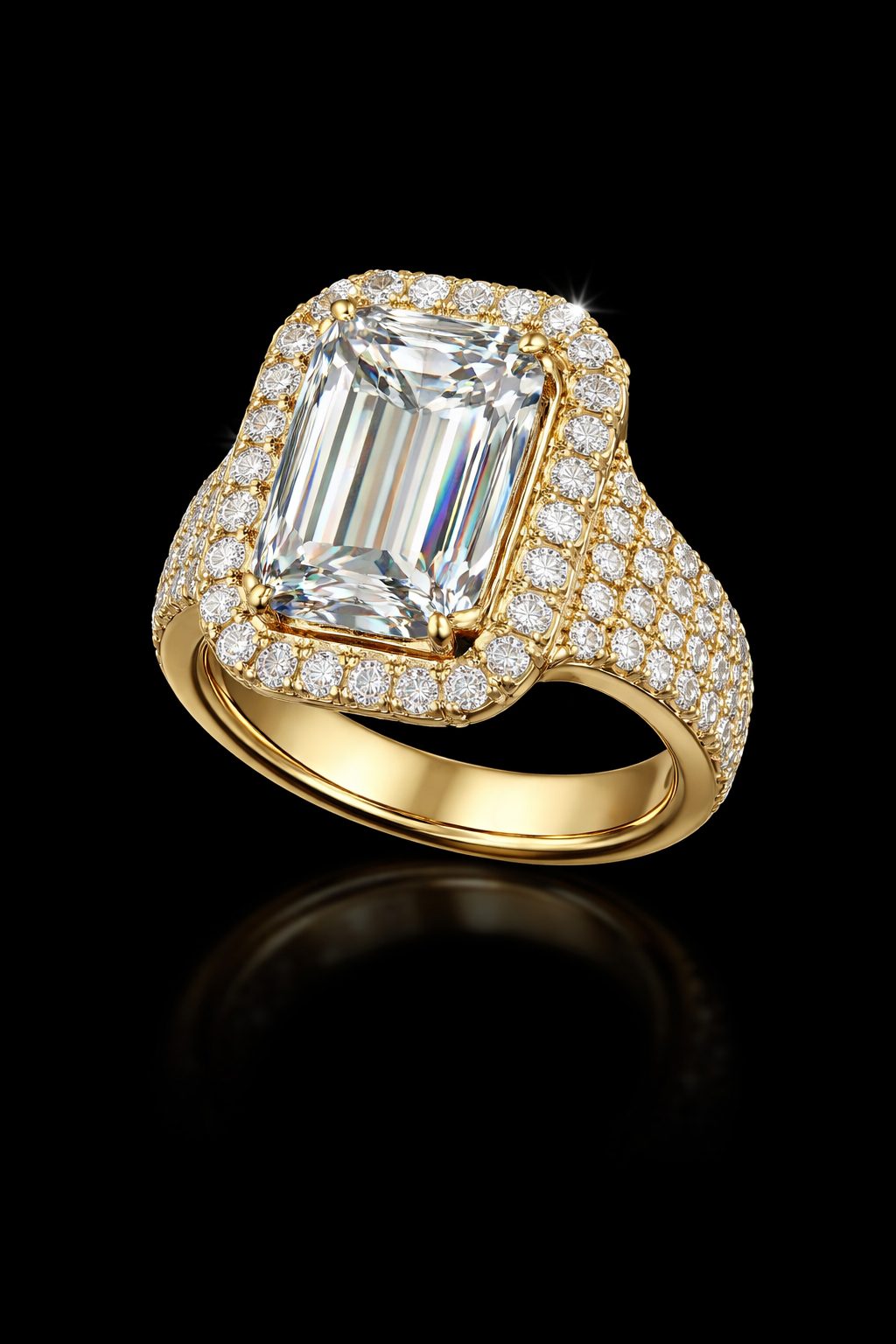 Emerald-cut diamond surrounded by a double pavé halo — commanding, unmistakable, unforgettable.