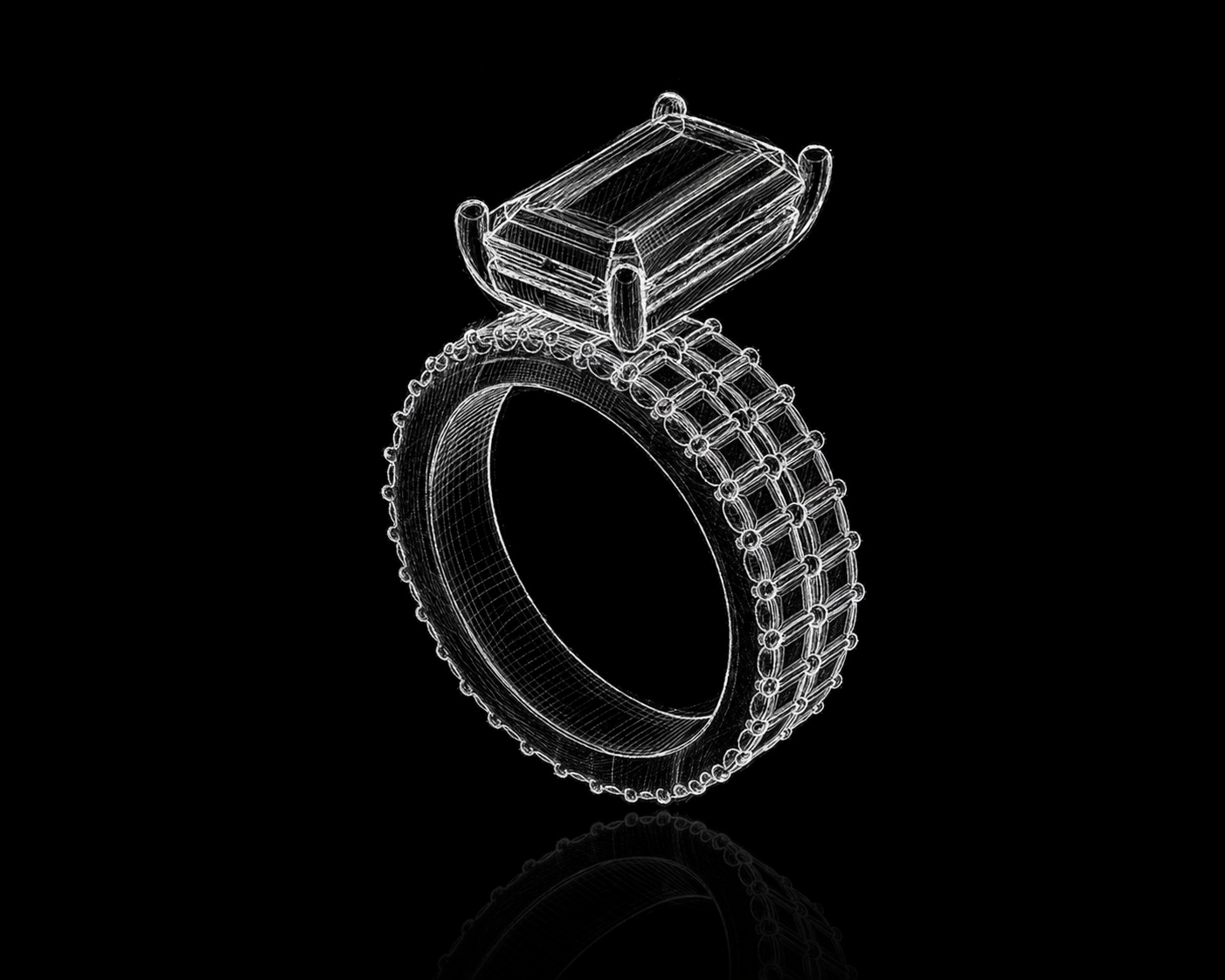 Every Montaire piece starts as a hand-drawn concept. Our designers capture your vision in detailed wireframe illustrations — mapping every facet, prong, and curve before a single tool touches metal.